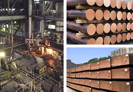 JX金属製錬の関連会社である日本鋳銅では、電気銅を原料として、伸銅品・電線分野向けの中間素材である型銅(ケークおよびビレット)を生産しています。同社は全連続鋳造設備により、タフピッチ銅、リン脱酸銅、無酸素銅等の多種多様な高品質型銅を生産しています。